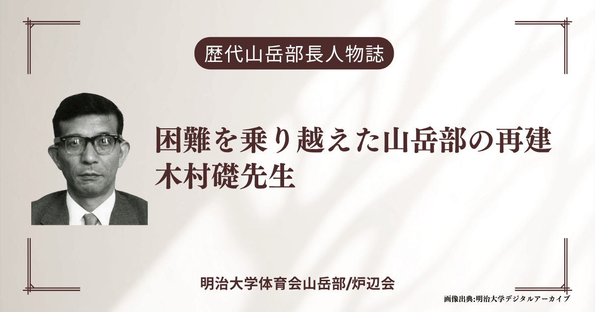 木村礎(きむら もとい)先生は学園紛争の嵐が吹き荒れる1970(昭和45年)4月、前任の渡辺操先生が亡くなられて1ヶ月のち、山岳部長に就いた。このとき先生は、大学改革の準備委員会委員長として多忙を極めていた。実は就任する10年前の1960(同35年)、渡辺部長が大学創立80周年記念のアラスカ学術調査で長期不在にすることから、文学部の後輩教授で、なおかつ駿台史学会で一緒の木村先生が山岳部長代理を務めた。この縁もあり、在職中に亡くなられた渡辺部長の後任として、山岳部長就任につながったと思われる。